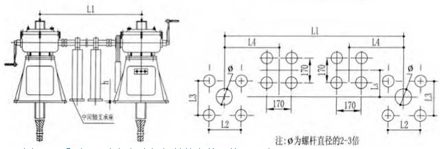 特點(diǎn)∶在手電兩用系列單吊點(diǎn)機(jī)型的基礎(chǔ)上,增加中間聯(lián)接軸,配有彈性聯(lián)軸節(jié),實(shí)現(xiàn)雙機(jī)同步。